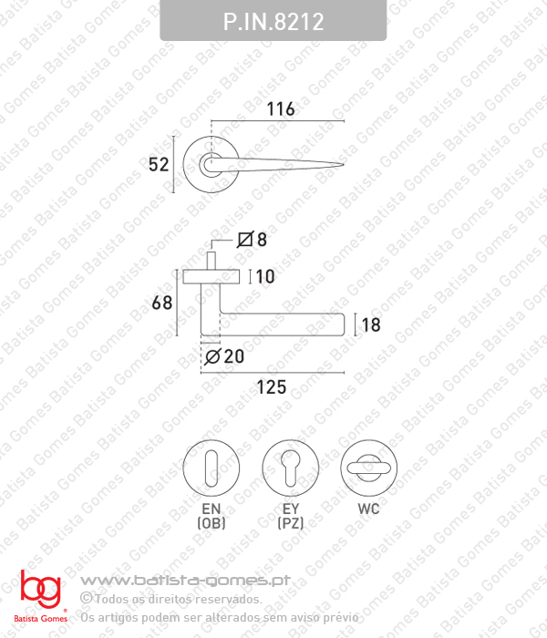 P.IN.8212 - Par puxador com entrada chave normal (EN) incluída P.IN.8212.Y - Par puxador com entrada para cilindro (EY) incluída P.IN.8212.SE - Par puxador sem entrada de chave P.IN.8212.SR - Sem roseta Para mais informações consultar desenho técnico