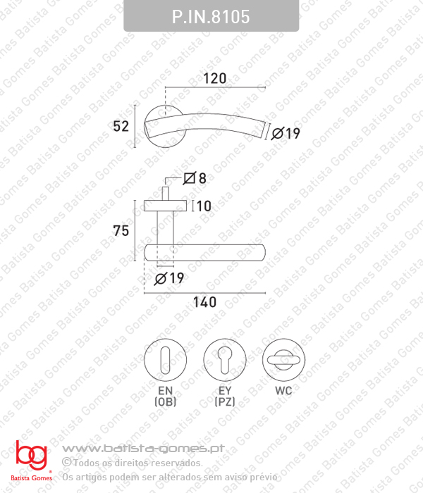 P.IN.8105 - Par puxador com entrada chave normal (EN) incluída P.IN.8105.Y - Par puxador com entrada para cilindro (EY) incluída P.IN.8105.SE - Par puxador sem entrada de chave Para mais informações consultar desenho técnico