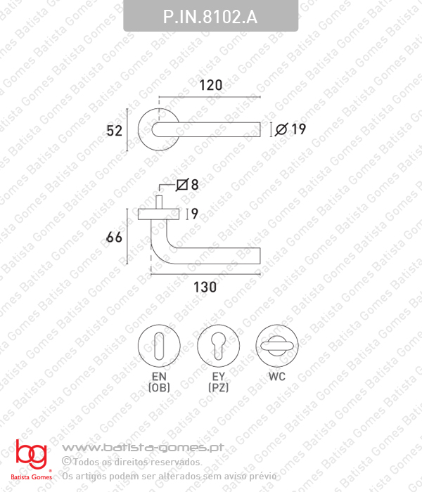 • Par Puxador • Incluem entradas de chave normal (EN) ou para cilindro (EY) • Rosetas cobertura inox com bases interiores metálicas • Molas de recuperação • Puxador fixo à roseta • Fixação oculta por parafusos e carrapeta a atravessar a porta + perno roscado nas muletas P.IN.8102.A - Par puxador com entrada chave normal (EN) incluída P.IN.8102.A.Y - Par puxador com entrada para cilindro (EY) incluída P.IN.8102.A.SE - Par puxador sem entrada de chave P.IN.8102.A.SR - Par puxador sem rosetaPara mais informações consultar desenho técnico