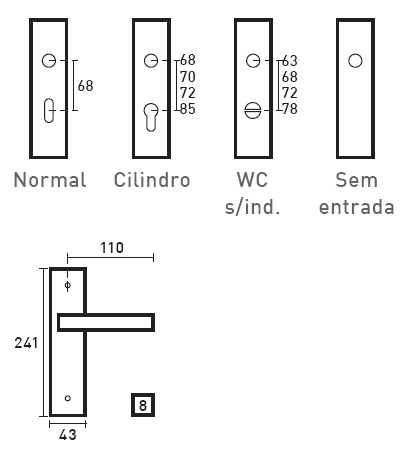- Par Puxador - Fornecimeto standard com entrada chave normal - Com molas de recuperação - Muleta fixa à placa - Fixação na placa por parafusos + carrapeta a atravessar a porta